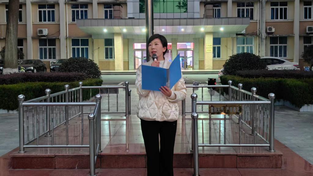伴随着慷慨激昂的《义勇军进行曲》,国旗护卫队迈着铿锵有力的步伐护送国旗入场,鲜艳的五星红旗在晨光中冉冉升起,全体师生肃立,行注目礼,高唱国歌,现场气氛庄严肃穆。